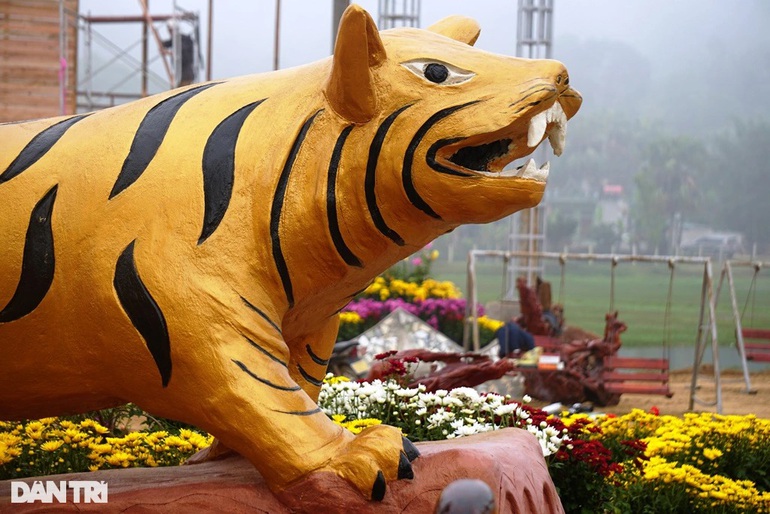Ghi nhận của PV Dân trí vào chiều 25/1, nhiều công nhân đang khẩn trương hoàn thiện khu vui chơi này. Trong khuôn viên có nhiều bức tượng như trâu, tuần lộc, ông già noel… và tượng hổ nói trên.