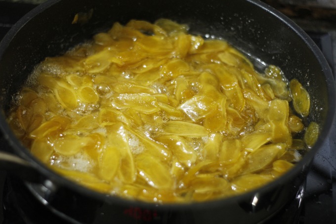 Đun nóng hỗn hợp gừng và đường cho tan chảy và sao lại trên lửa nhỏ