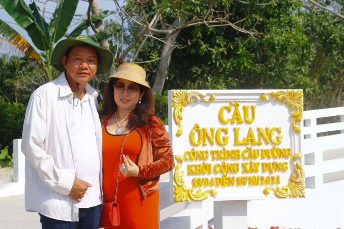 Vợ chồng ông Lang bên cạnh cây cầu do mình đầu tư xây mới, tháng 10/2021. Ảnh: Nhân vật cung cấp
