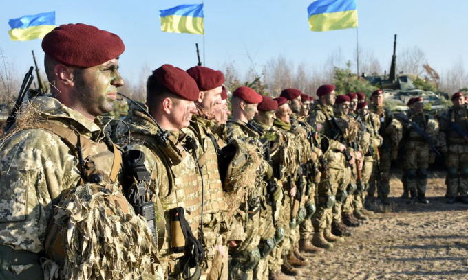 Lính Ukraine tham gia diễn tập ở vùng Zhytomyr, Ukraine hồi tháng 11/2021. Ảnh: Reuters.