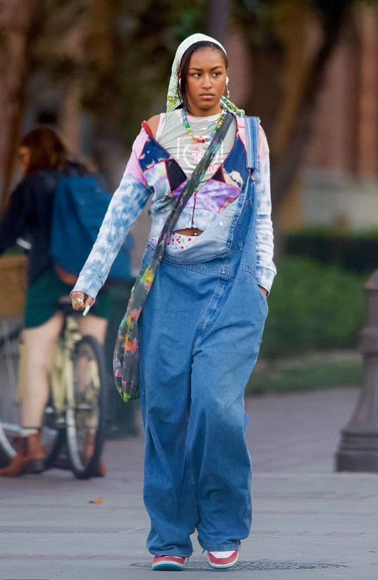 Trong khi đó em gái Sasha xuất hiện trên phố với chiếc quần yếm denim độc đáo, áo và túi loang màu cùng khăn trùm đầu màu xanh nhạt. Cô để bộ móng tay dài, sơn màu xanh nõn chuối, cổ đeo chuỗi hạt nhiều màu sắc, tay đeo nhiều chiếc nhẫn to bản.
