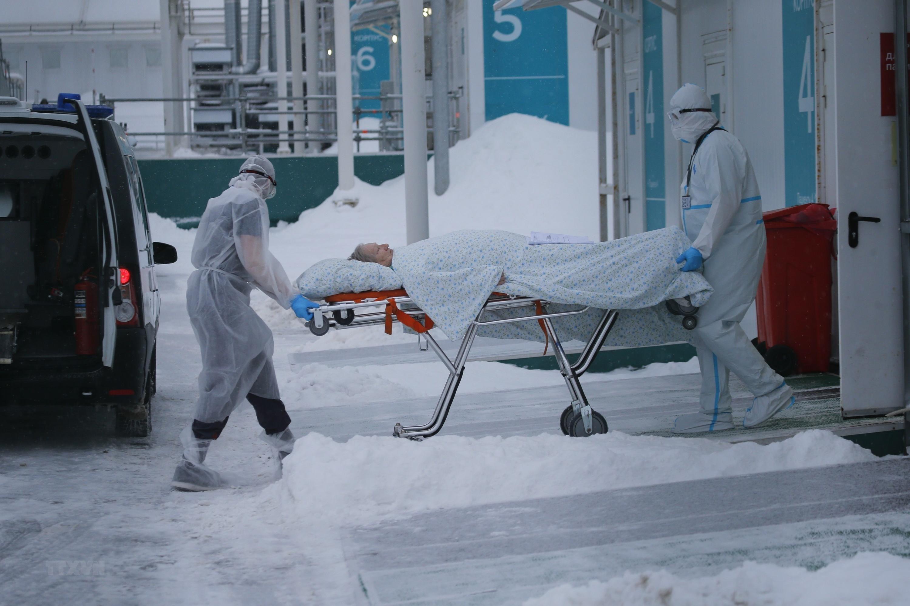 Nhân viên y tế chuyển bệnh nhân COVID-19 tại bệnh viện ở Kommunarka, Nga, ngày 29/1/2022. (Ảnh: THX/TTXVN)