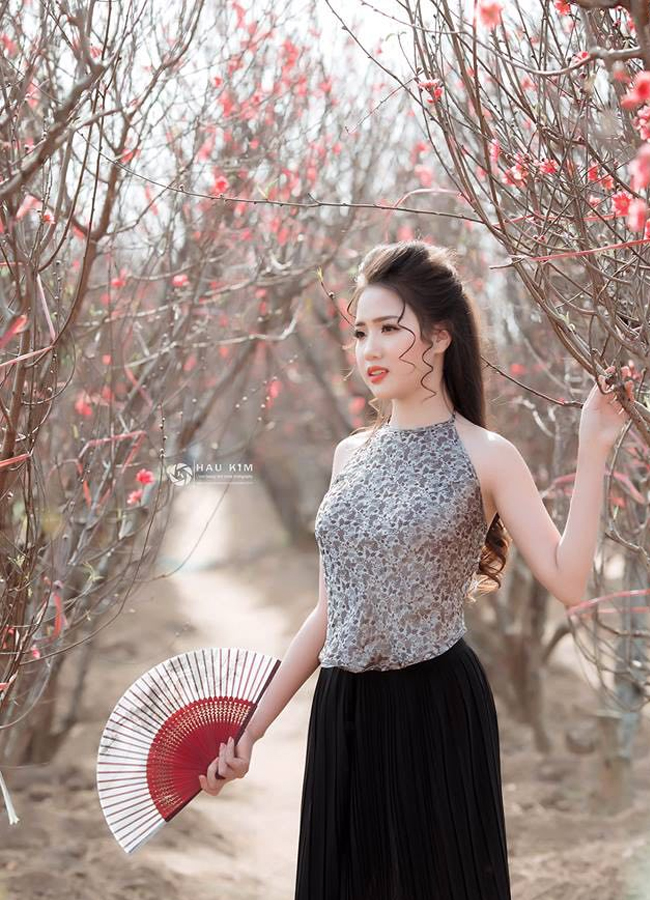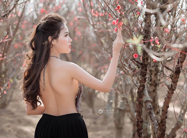 Ngày nay các cô gái không chỉ diện yếm chụp ảnh với hoa sen mỗi khi hè về mà còn táo bạo chụp ảnh ở vườn đào nhân dịp Tết.