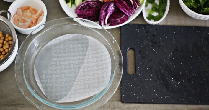 Bước 1: Nhúng bánh tráng vào nước ấm. Bạn có thể cảm nhận được bánh tráng sẽ mềm dần dưới đầu ngón tay, vậy nên đừng để quá lâu nếu không bánh tráng sẽ bị nhũn và dễ rách khi cuộn.