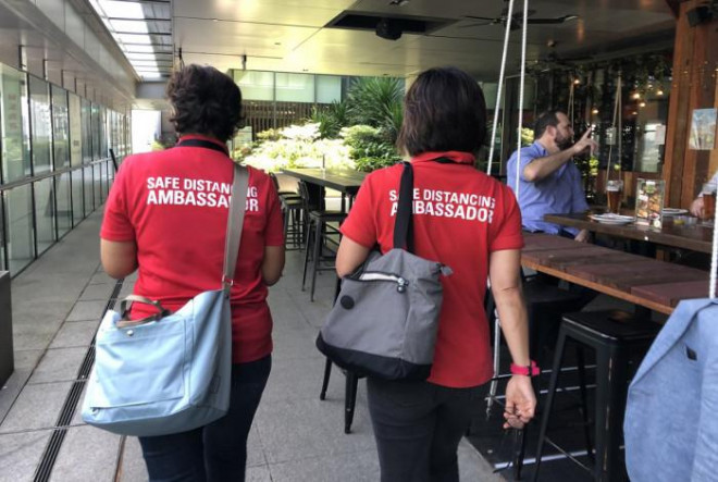 Các “Đại sứ giãn cách xã hội” thường được cử tới các trung tâm mua sắm, nhà hàng, quán bar để nhắc nhở người dân thực thi đúng quy định phòng dịch như đeo khẩu trang đúng cách, hạn chế tụ tập quá 5 người…