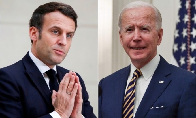 Tổng thống Pháp Emmanuel Macron (trái) và Tổng thống Mỹ Joe Biden. Ảnh: AFP.