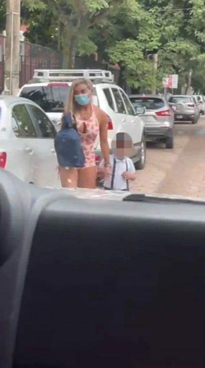 Trong đoạn clip do một phụ huynh khác ghi lại, Vanesa bước xuống xe, cầm cặp sách hộ con trai rồi dắt bé đến cổng.