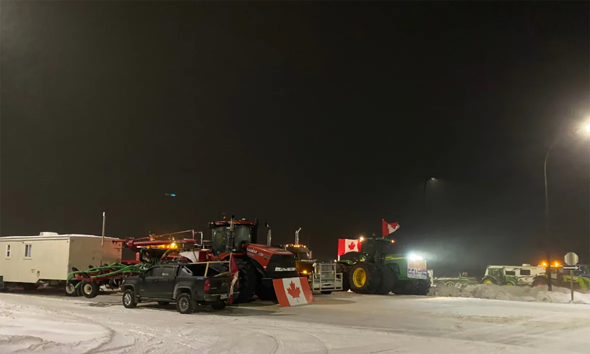 Máy kéo và xe tải tham gia biểu tình chặn đường cao tốc ở Emerson, tỉnh Manitoba, Canada ngày 10/2.