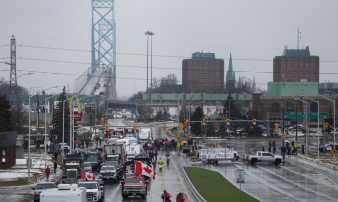 Đoàn người biểu tình chặn xe gần cầu Ambassador ở Windsor, Ontario, Canada, hôm 11/2. Ảnh: Reuters.