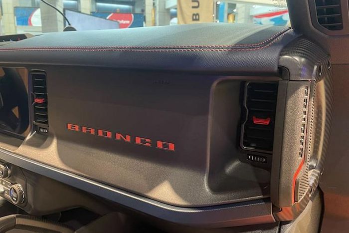 Tương tự ngoại thất, nội thất của Ford Bronco Raptor 2022 cũng có một số trang bị riêng như bảng đồng hồ kỹ thuật số với màn hình 12 inch, vô lăng dày dặn hơn, ốp carbon và ghế thể thao do Ford Performance chế tạo. Ghế của xe có thể bọc bằng vinyl hoặc da lộn, tùy theo lựa chọn của người dùng. Trong khi đó, logo Raptor xuất hiện ở nhiều nơi như vô lăng và tựa đầu ghế.