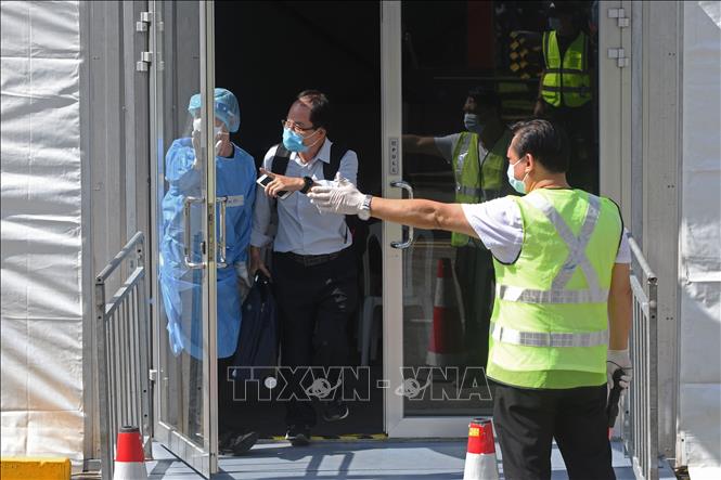 Nhân viên hướng dẫn hành khách trong chương trình Làn đi lại cho người đã tiêm vaccine (VTL), tại Singapore . Ảnh: THX/TTXVN