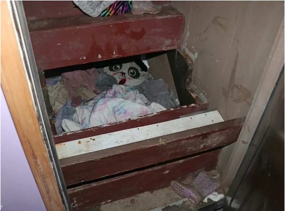 Bé gái Paislee Shultis và nơi em bị giấu ở chân cầu thang. Ảnh: Sở Cảnh sát TP Saugerties