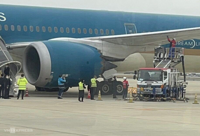 Máy bay B787-868 kiểm tra kỹ thuật tại sân bay Fukuoka. Ảnh: Hành khách cung cấp.