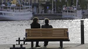 Người chồng thì chỉ vào ông lão và bào lão đang ngồi bóp vai cho nhau trên ghế đá, bảo:
