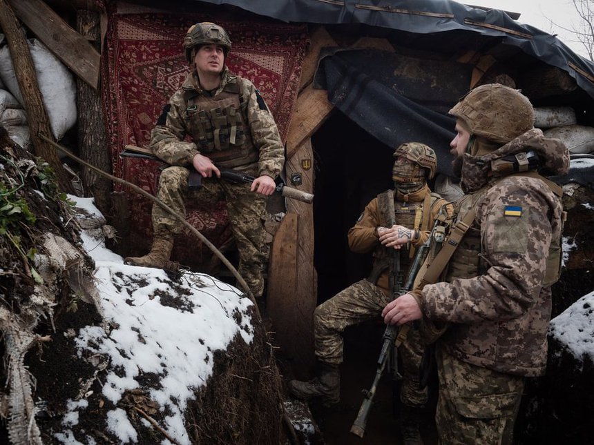 Ba người lính Ukraine - Pinochet, Bonehead và Godzilla - bên chiến hào. Ảnh: Guardian.