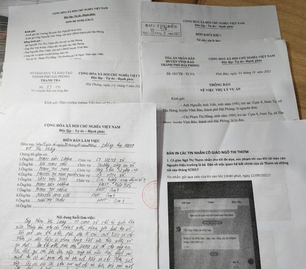 Vì vậy, chị Hằng đã báo cáo sự việc đến Hiệu trưởng, trường Tiểu học Tân Hưng và các ban ngành chức năng. Sau đó, cô Thơm nhắn tin đe dọa và thúc ép chồng chị Hằng ly hôn. Tháng 1 năm 2021, cô Thơm đã sinh một con gái với chồng chị Hằng. Tháng 9 năm 2021, anh Viết đã nộp đơn ly hôn ra Tòa án Nhân dân huyện Vĩnh Bảo khiến gia đình chị có nguy cơ tan vỡ.
