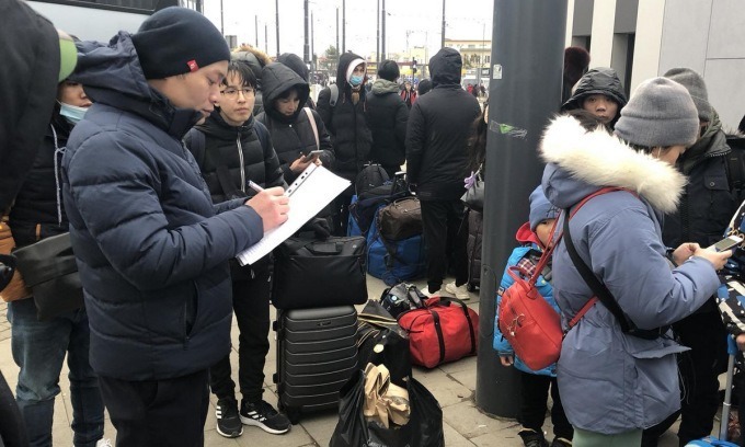 Người Việt chuẩn bị lên xe di chuyển tại Lviv, miền tây Ukraine, ngày 2/3. Ảnh:BNG.