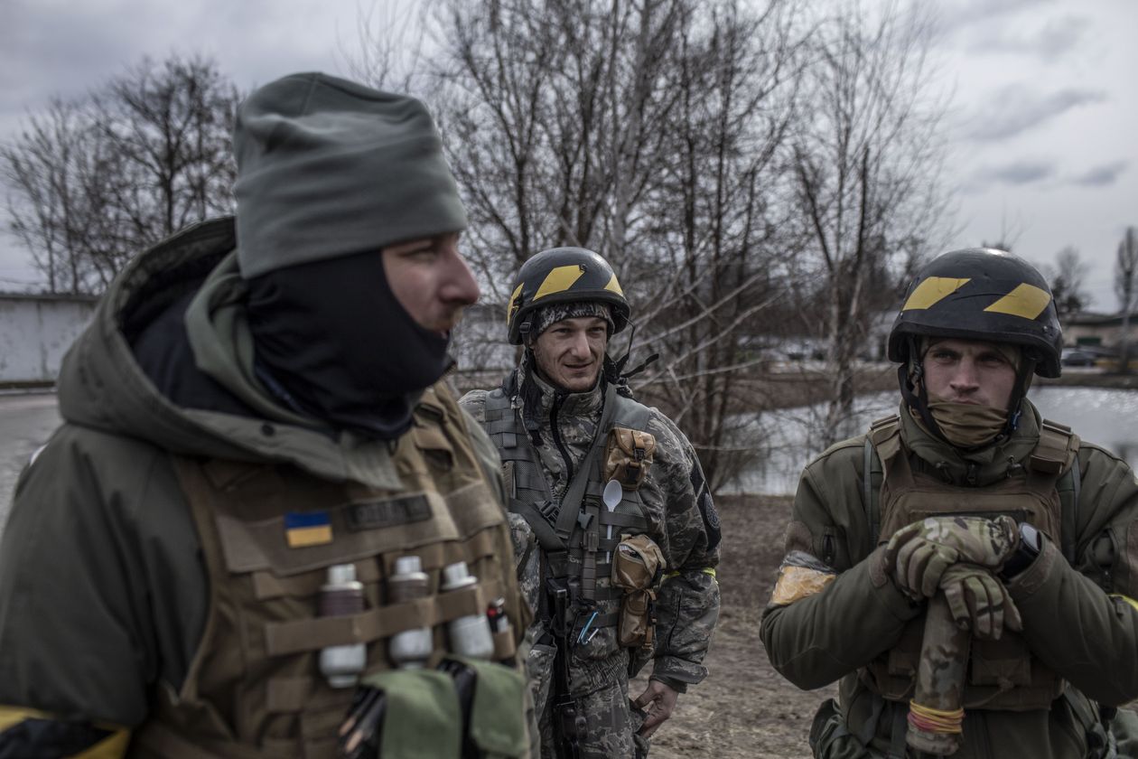 Chỉ huy Volodymyr, bên trái bên cạnh các thành viên đội đặc nhiệm Ukraine mà ông dẫn đầu đang chốt chặn ở ngoại ô thủ đô Kiev để ngăn quân Nga tiến vào trung tâm thành phố. Ảnh The Wall Street Journal.