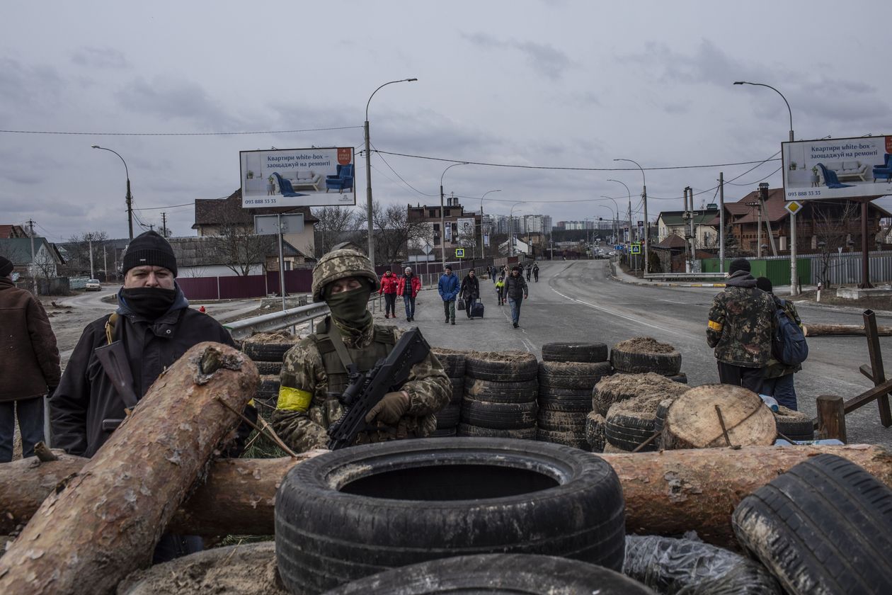 Dân thường đã chạy trốn các cuộc giao tranh ở Irpin, thị trấn ở ngoại ô Kiev hiện do lực lượng đặc nhiệm Ukrain chốt chặn, chống lại các cuộc tấn công của Nga. Ảnh The Wall Street Journal.
