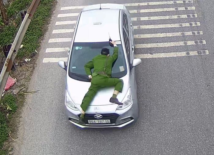 Quý bỏ chạy gần 3 km mặc cho cán bộ công an nằm trên nắp capo xe. Ảnh: Công an Bắc Giang.