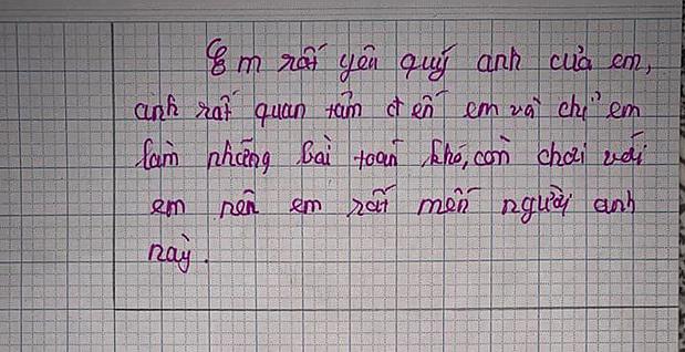 Nếu có bài nào khó thì anh luôn chỉ em từng chi tiết để em hiểu rõ hơn. Anh của em nay đã hai mươi tuổi, hơn em mười tuổi. Anh đã là sinh viên trường đại học năm hai hay năm ba gì đó. Chỉ số thông minh của anh là 217. Anh thường hay đi học rồi ở nhà trọ. Thường thì mấy tuần, khoảng từ 3-4 tuần hoặc ngày lễ thì anh lại về nhà chơi. Anh học bên thành phố Hồ Chí Minh nên rất lâu mới về nhà. Em rất yêu quý anh của em. Anh rất quan tâm đến em và chỉ em làm những bài toán khó. Anh còn chơi với em nên em rất mến người anh này".
