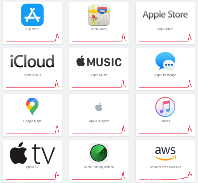 Nhiều người dùng không thể truy cập iMessage, iCloud, Apple Music, Maps hay Apple TV trong hàng giờ. Trên trang Downdetector - website chuyên phản ánh sự cố của các dịch vụ Internet. 10 trên 12 dịch vụ bị báo cáo lỗi truy cập nhiều và gần nhất lúc 1h đều thuộc về Apple.