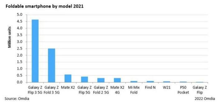 Công ty phân tích Omedia vừa đưa ra báo cáo cho biết Samsung chiếm 61% lượng smartphone gập bán ra trong năm năm 2021. Trong 11 model sở hữu màn hình uốn dẻo, có đến 5 mẫu là của nhà sản xuất Hàn Quốc, còn lại là từ Trung Quốc như Xiaomi, Huawei.