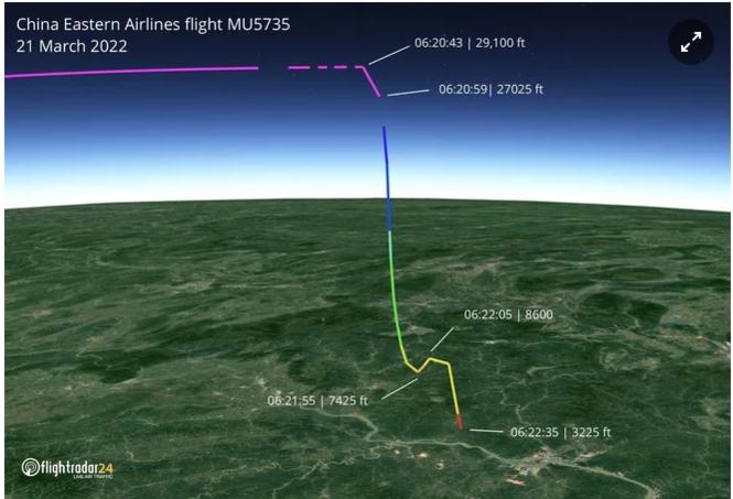 Theo dữ liệu từ FlightRadar24, chiếc máy bay gặp nạn ở tỉnh Quảng Tây, Trung Quốc đang ở độ cao khoảng 8.800 m vào lúc 14h20 ngày 21/3 thì bắt đầu lao xuống với vận tốc lớn, South China Moring Post đưa tin hôm 23/3.