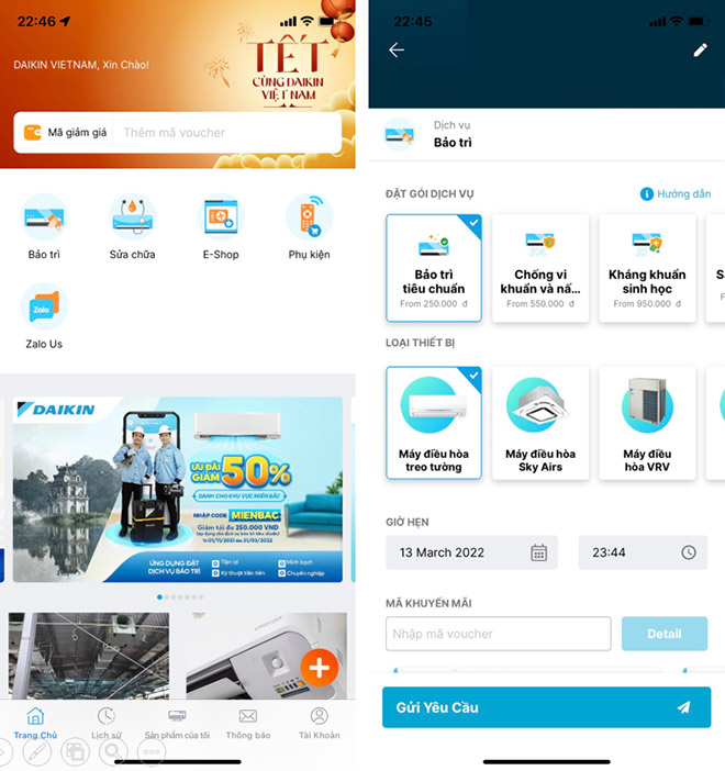 Daikin là một trong số thương hiệu điều hòa không khí đầu tiên ra mắt ứng dụng đặt dịch vụ bảo trì, sửa chữa điều hòa tại Việt Nam. Ứng dụng này dễ sử dụng như các app đặt xe, gọi đồ ăn phổ biến hiện nay. Ra mắt từ tháng 9/2020, dịch vụ ban đầu chỉ triển khai ở ba thành phố lớn là Hà Nội, TP HCM và Đà Nẵng, app được người tiêu dùng đón nhận nhờ đáp ứng 4 tiêu chí: tiện lợi, minh bạch, chuyên nghiệp và kỹ thuật tiên tiến.