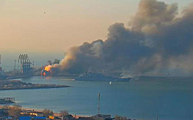Hình ảnh lấy từ video đang trên mạng ngày 24 tháng 3, 2022 cho thấy khói đen bốc lên từ một nơi được nói là tàu chiến Nga bị trúng đạn tại hải cảng Berdyansk, miền nam Ukraine.
