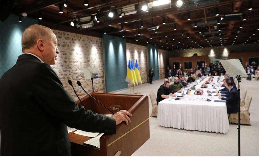 Tổng thống Thổ Nhĩ Kỳ phát biểu trước đoàn đàm phán Nga và Ukraine, ngày 29/3. Ảnh: Reuters.