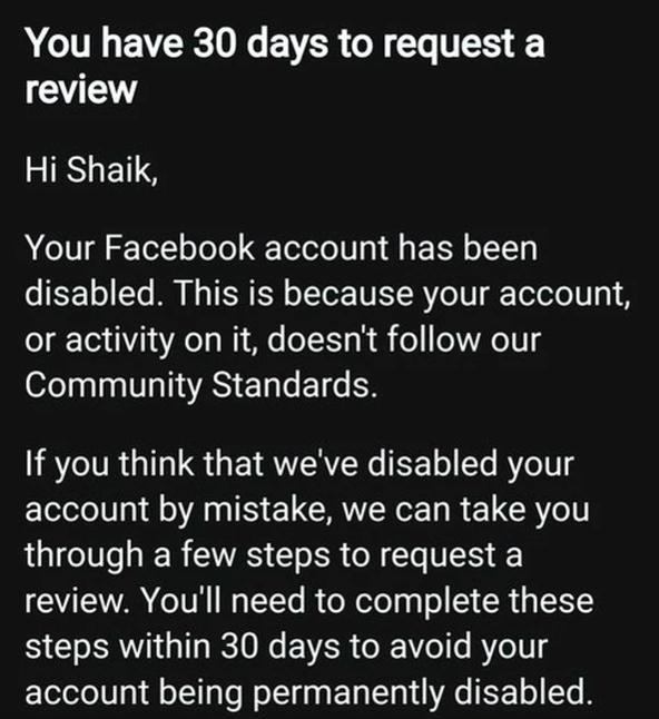Những người này cho biết, họ chỉ nhận được thông báo có nội dung: "Tài khoản Facebook của bạn đã bị vô hiệu hóa vì không tuân thủ các Tiêu chuẩn Cộng đồng của nền tảng. Quyết định này không thể đảo ngược". Họ cũng không hề nhận được cảnh báo cũng như những giải thích nào liên quan.
