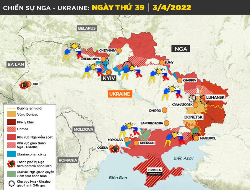 Trước đó Mỹ đánh giá rằng Nga đã sửa đổi chiến lược ở Ukraine, tập trung vào việc cố gắng giành quyền kiểm soát Donbasss và các vùng phía đông khác trong thời hạn mục tiêu là đầu tháng Năm tới.