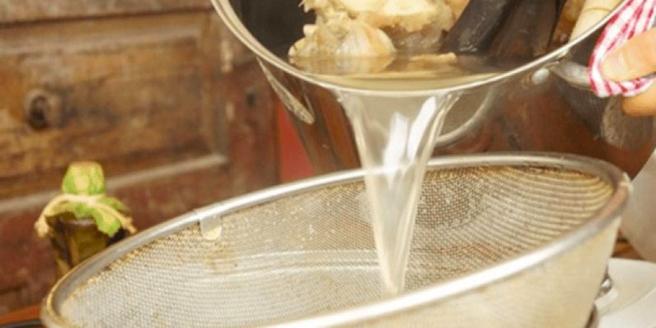 Nếu bạn ninh xương gà bị đục, có thể cho tiếp xương gà vào đun thêm để nước xương trong hơn. Trước khi dùng, lọc nước xương qua rây mắt nhỏ hoặc vải lọc để lấy phần nước dùng trong.
