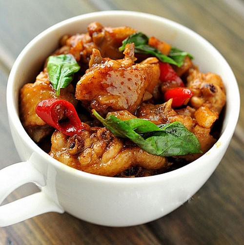 Thịt gà xào húng quế kiểu Đài Loan có màu cánh gián hấp dẫn, mùi thơm nồng quyến rũ, vị mặn ngọt vừa phải ăn rất bắt miệng.