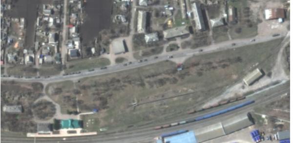Theo hình ảnh vệ tinh của Maxar Technologies, đoàn xe kéo dài tới 65 km, từ làng Prybisk - nơi cách trung tâm Kyiv gần 100 km về phía bắc - tới sân bay Antonov ở ngoại ô Kyiv. Dù vậy, đoàn xe này sau đó được phân tán và di chuyển một phần vào các khu rừng quanh đó.
