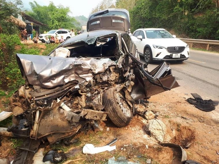 Hai ôtô di chuyển ngược chiều đã va chạm với nhau, hậu quả một người tử vong, 2 người bị thương. Cú va chạm mạnh khiến ôtô con nát phần đầu.