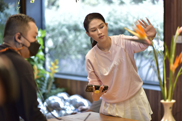 Ngọc Thanh Tâm trao đổi với nhân viên cắm hoa