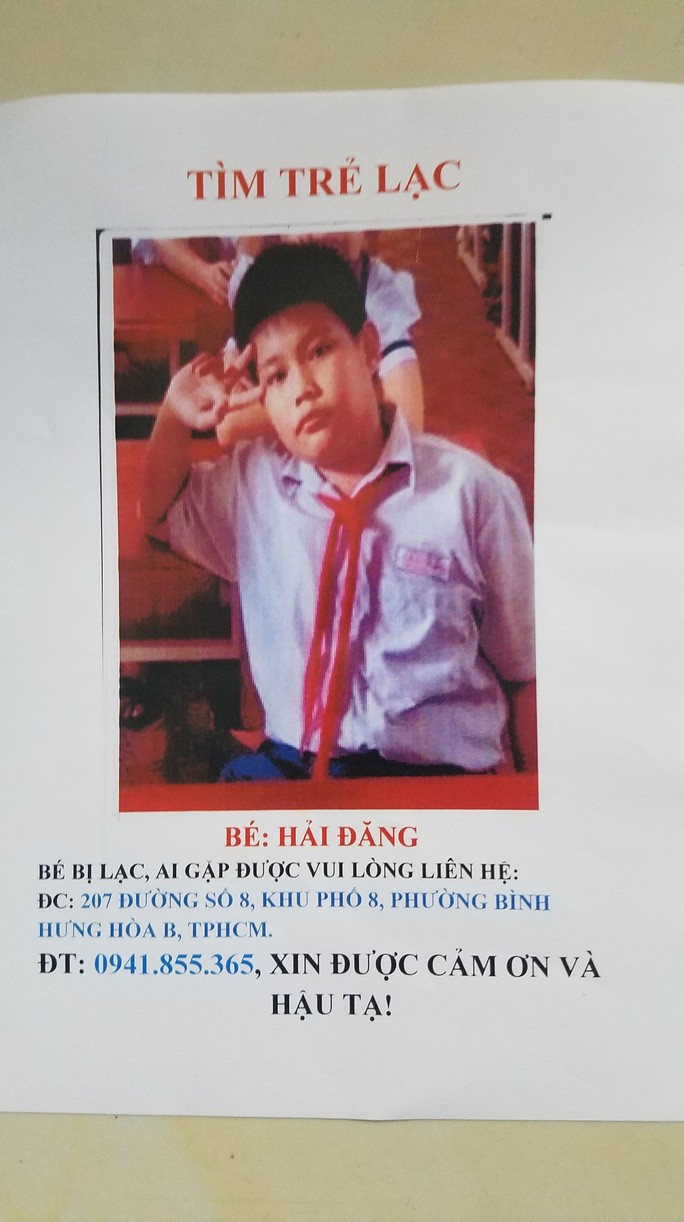 Chị Dung cho biết, con trai chị là cháu N.T.Hải Đăng (13 tuổi), hiện đang học lớp 7 Trường THCS Huỳnh Văn Nghệ, quận Bình Tân. Cháu rời khỏi nhà vào trưa ngày 28/3 và mất liên lạc với gia đình sau đó.