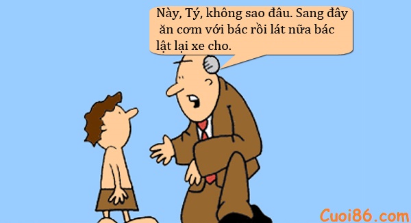 – Này, Tý, không sao đâu. Sang đây ăn cơm với bác rồi lát nữa bác lật lại xe cho.