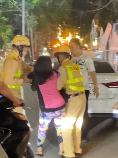 Cả 2 chiến sĩ CSGT có mặt ở đó vẫn bình tĩnh khuyên nhủ: "Tôi cảnh cáo chị, chị bỏ tay ra, tôi đang mặc sắc phục nhà nước. Chị đang vi phạm giao thông, chúng tôi được tạm giữ bằng lái xe".