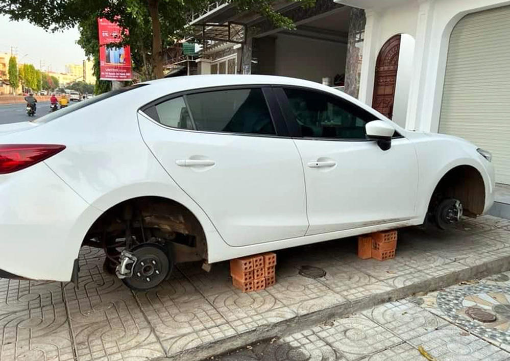 Sáng ngày 18 Tháng Tư, chuẩn bị bước lên chiếc xe hơi đậu trước cửa chuẩn bị đi làm, anh Nguyễn Văn Tùng (28 tuổi) giật mình khi thấy chiếc xe không còn cái bánh nào.