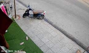 Xe máy tự lùi khỏi vỉa hè xuống đường. Chiếc xe máy tuột dần xuống đường nhưng nhờ khả năng 'thần kỳ' nào đó nó vẫn đứng vững.