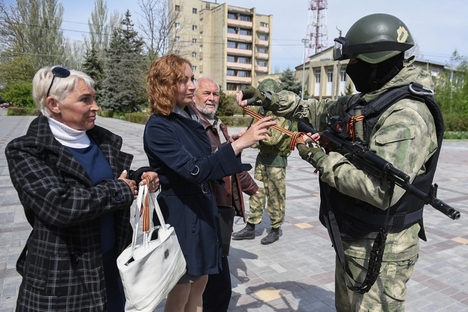 Một quân nhân Nga phân phát ruy băng cho một số người dân tại tỉnh Kherson, miền nam Ukraine hôm 4/5, trước lễ kỷ niệm 77 năm chiến thắng phát xít. Ảnh: AFP.