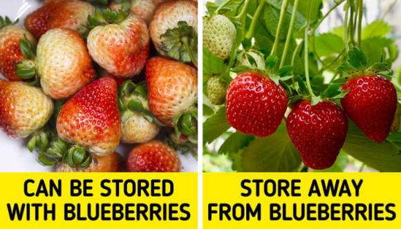 Nếu bạn bảo quản chúng cùng nhau, dâu tây có thể chín quá và hỏng sớm hơn bình thường. Bạn có thể bảo quản dâu tây chưa chín với quả việt quất cùng nhau, tuy nhiên, nếu cả hai loại quả đều đã quá chín, hãy ăn trong vòng vài ngày.