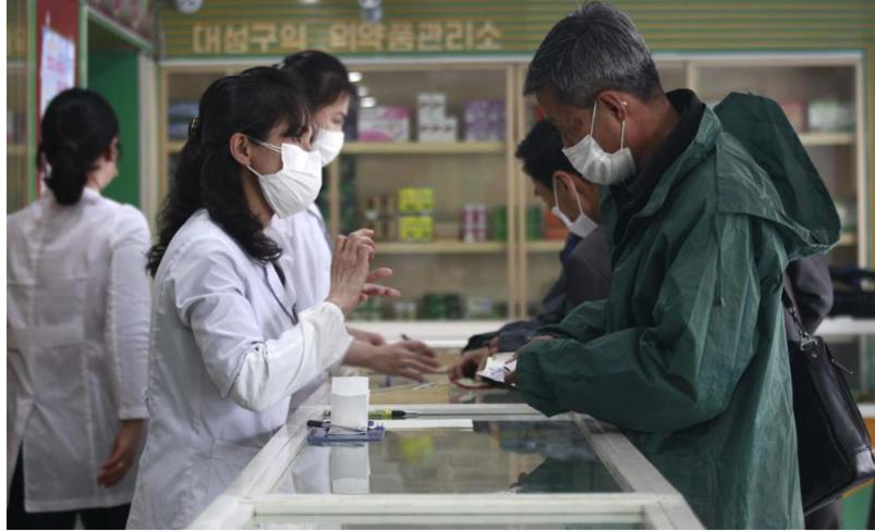 Các nhân viên của văn phòng quản lý thuốc tại Bình Nhưỡng đang cung cấp thuốc cho người dân. Ảnh: AP.