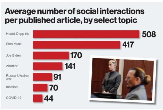 Cuộc chiến căng thẳng giữa Nga và Ukraine không khiến người Mỹ muốn đọc như khi nghe Heard kể tội chồng cũ, với trung bình 91 lượt tương tác. Ngay cả Tổng thống Joe Biden cũng không được quan tâm nhiều như Depp và Heard.
