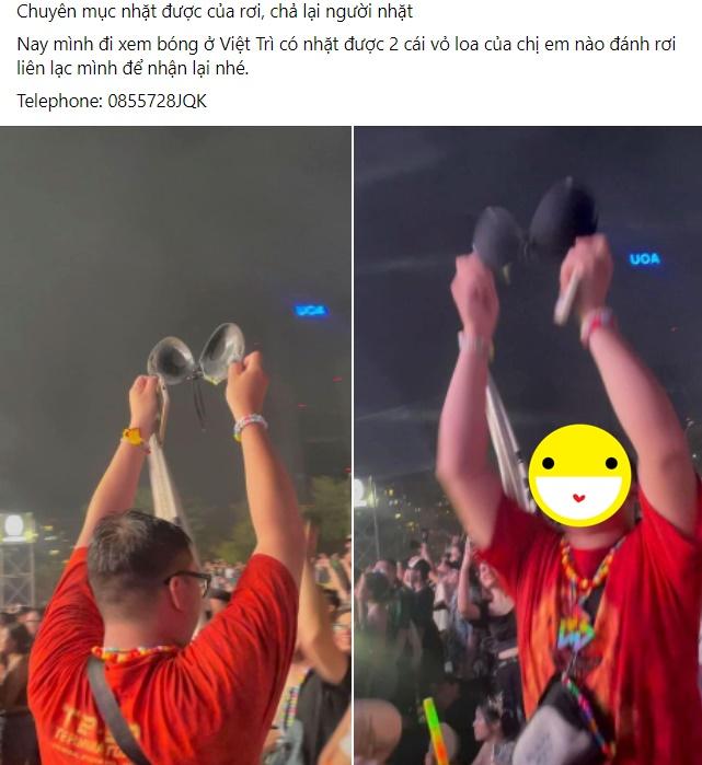"Chuyên mục nhặt được của rơi, trả lại người nhặt. Nay mình đi xem bóng ở Việt Trì có nhặt được 2 cái vỏ loa của chị em nào đánh rơi, liên lạc mình để nhận lại nhé. Telephone: 0855728JQK", anh viết đính kèm hình ảnh đang cầm "hàng".