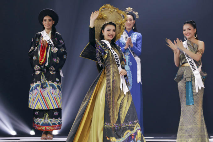 Thí sinh trình diễn trang phục bản sắc Việt ở đầu chung kết. Ảnh: Kiếng Cận