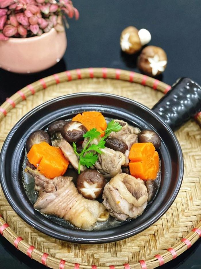 - Khi thịt gà mềm, cho cà rốt và nấm hương vào hầm, thêm nước vào xâm xấp gà, đun khoảng 10 phút thì tiếp tục cho nấm rơm, hành tây vào. Hòa tan bột năng với ít nước lọc, sau đó đổ vào nồi tiếp tục đun đến khi nước thịt sánh lại, nêm nếm gia vị cho vừa khẩu vị rồi tắt bếp.